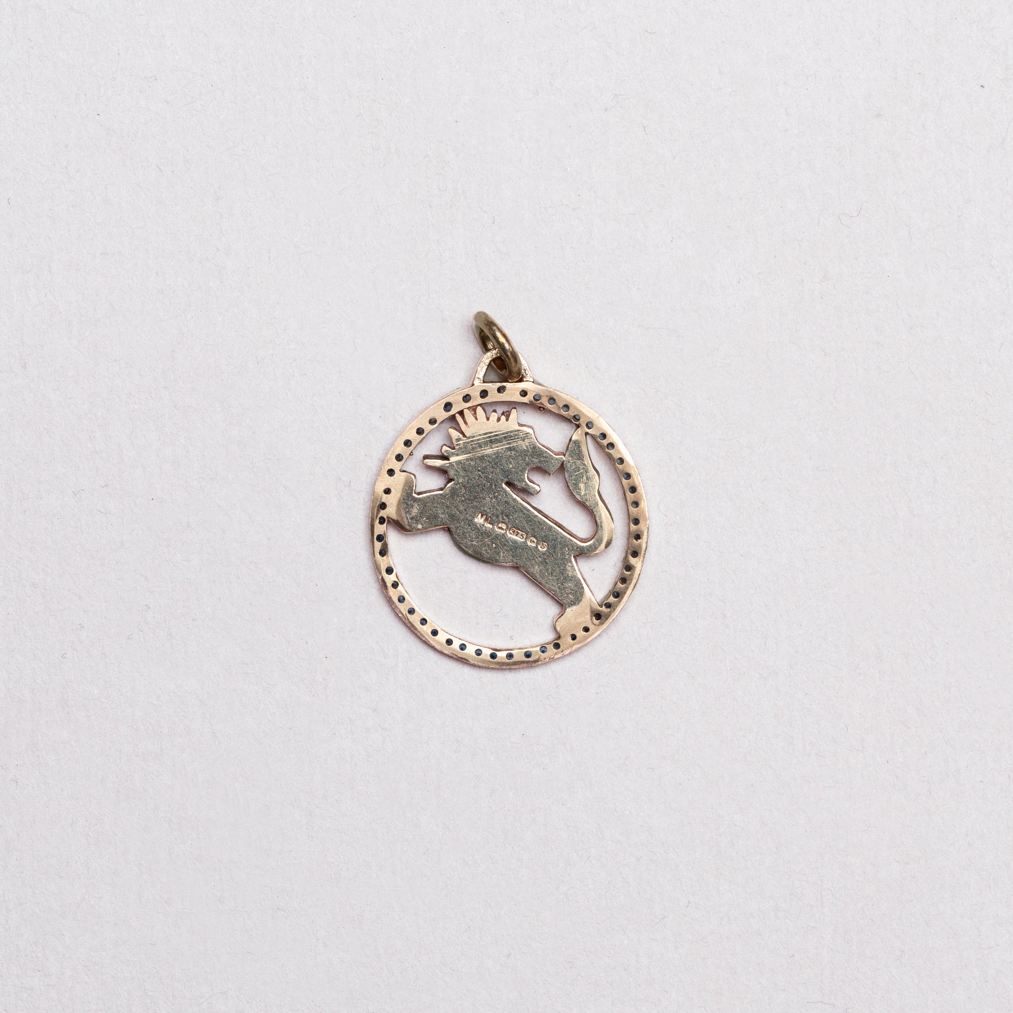 An incredibly charming 9ct gold charm featuring a delightful, whimsical lion motif enclosed within a circular frame, beautifully accented with a border of sapphires for added sparkle. A perfect and thoughtful present for a Leo, or anyone who loves symbolic and characterful jewellery.