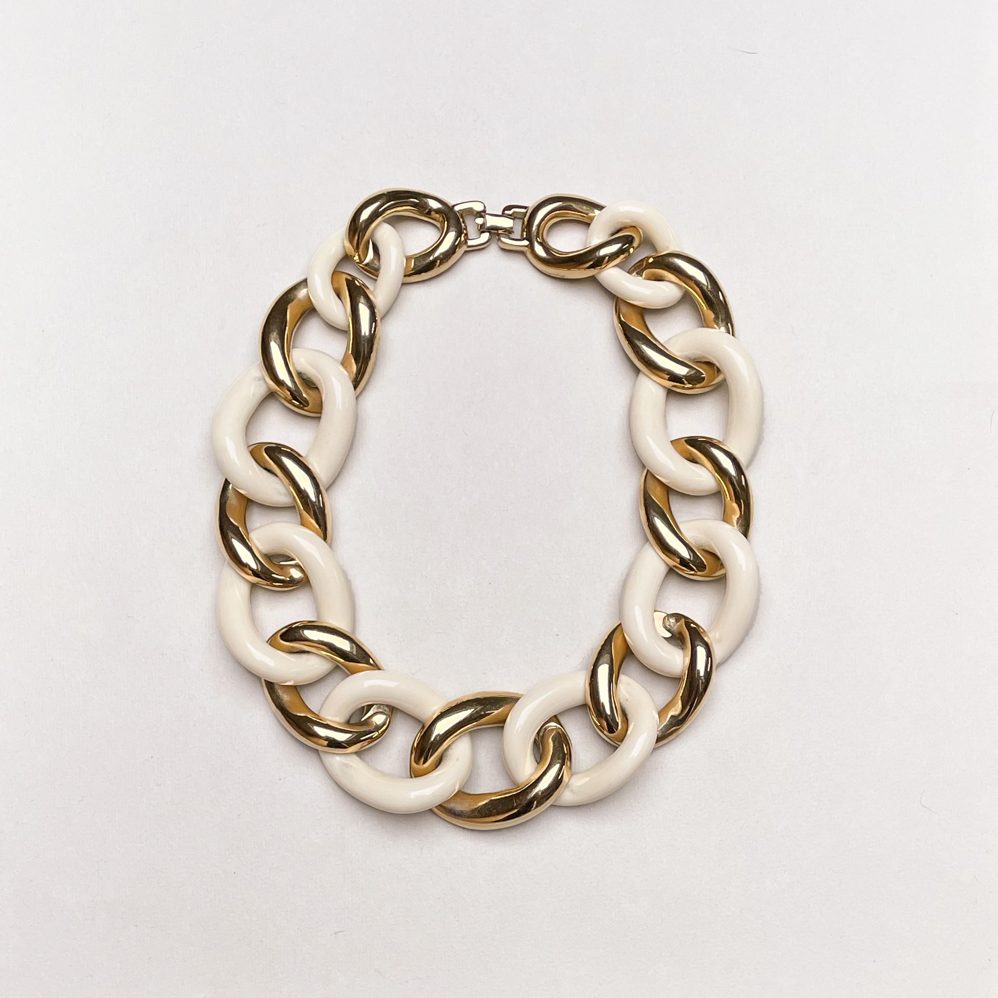 Vintage Givenchy chain necklace composed of oversized oval links in alternating finishes. - smooth, glossy ivory-colored links are interlocked with polished gold-tone metal links, creating a balanced two-tone contrast.