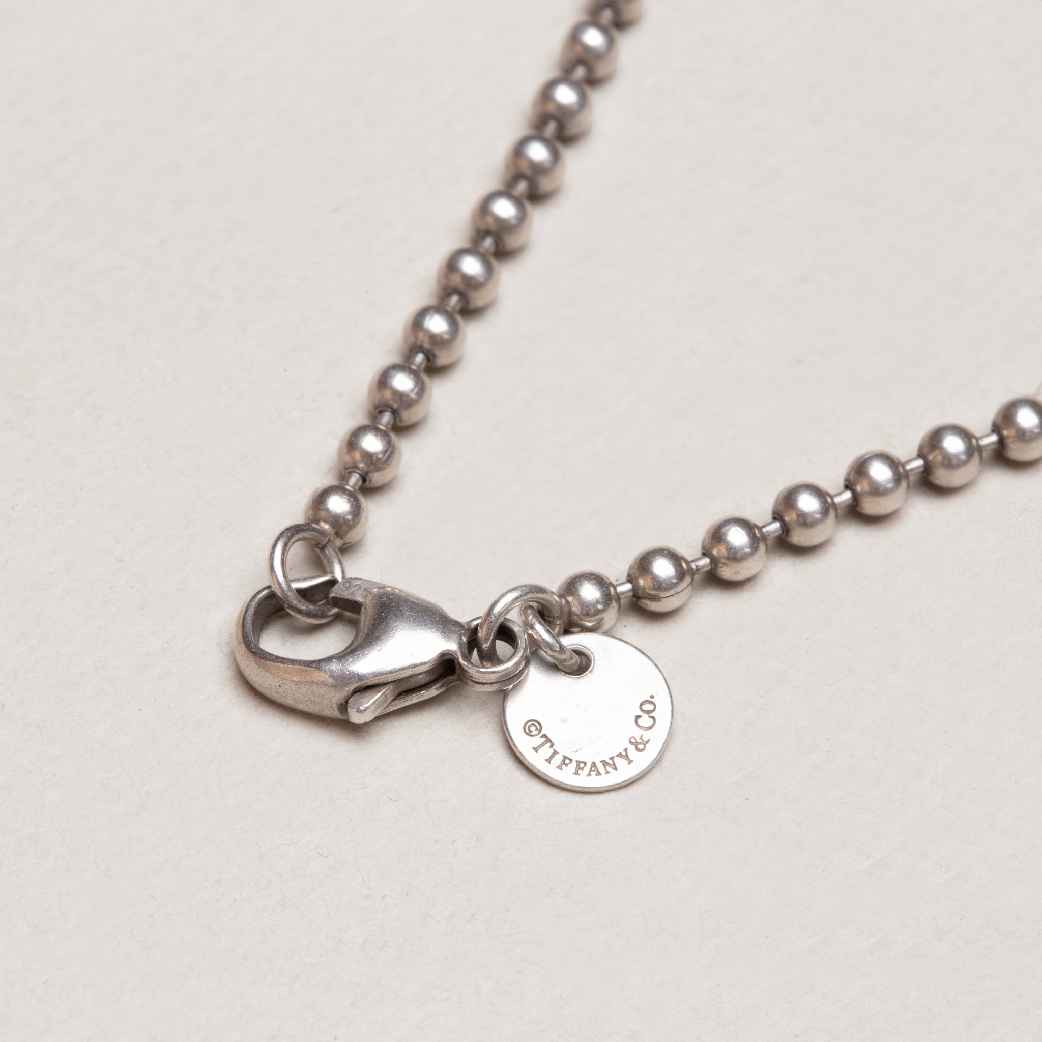 The necklace features a continuous strand of polished silver beads, finished with a secure lobster clasp and the iconic Tiffany & Co. round tag, engraved with the brand name - a classic Tiffany staple!