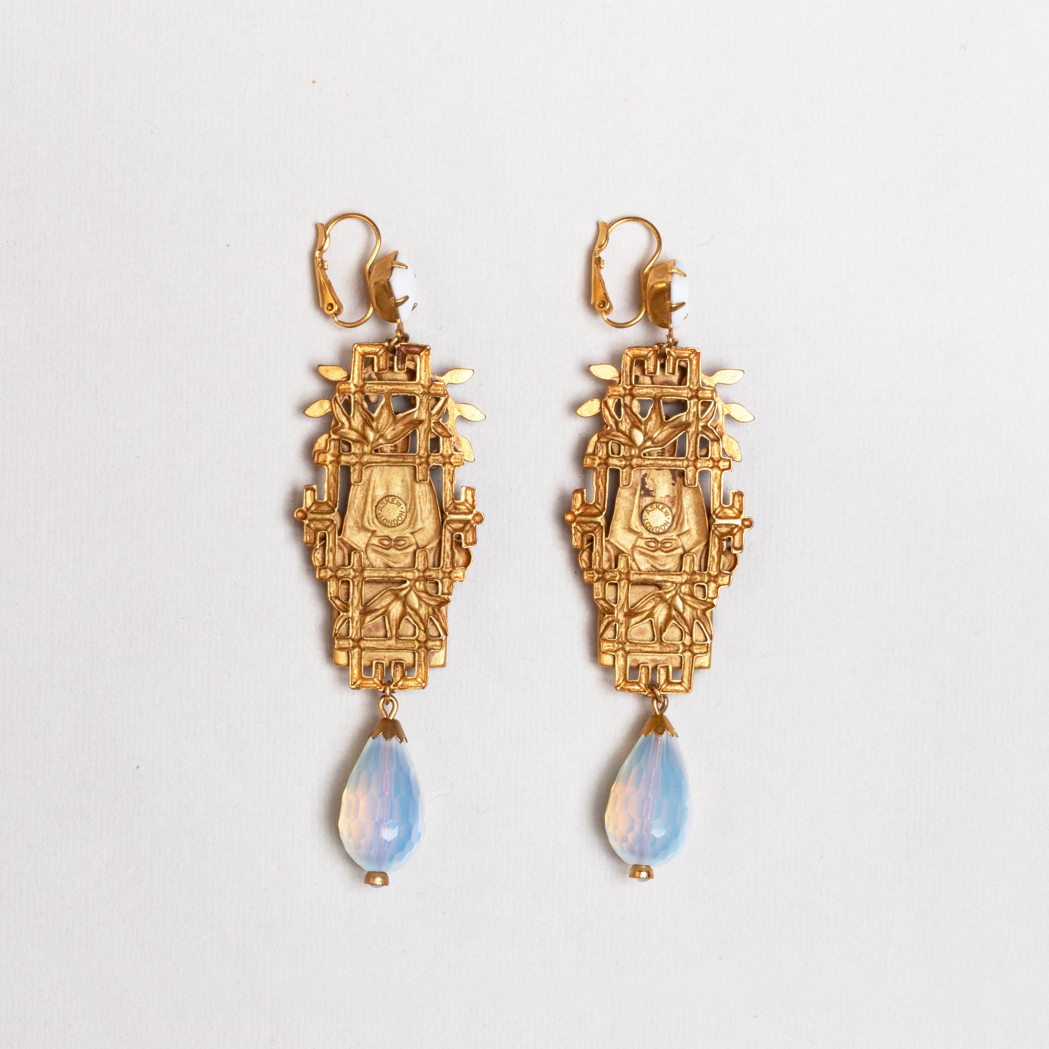 These striking Askew London earrings feature an ornate, sculptural Buddha motif framed by stylised foliage and accented with milky white cabochons. A faceted opalescent teardrop stone is suspended below, catching light with a soft iridescent glow. Crafted in the brand’s signature antiqued gilt finish, the earrings have a distinct sense of theatricality and old-world charm.