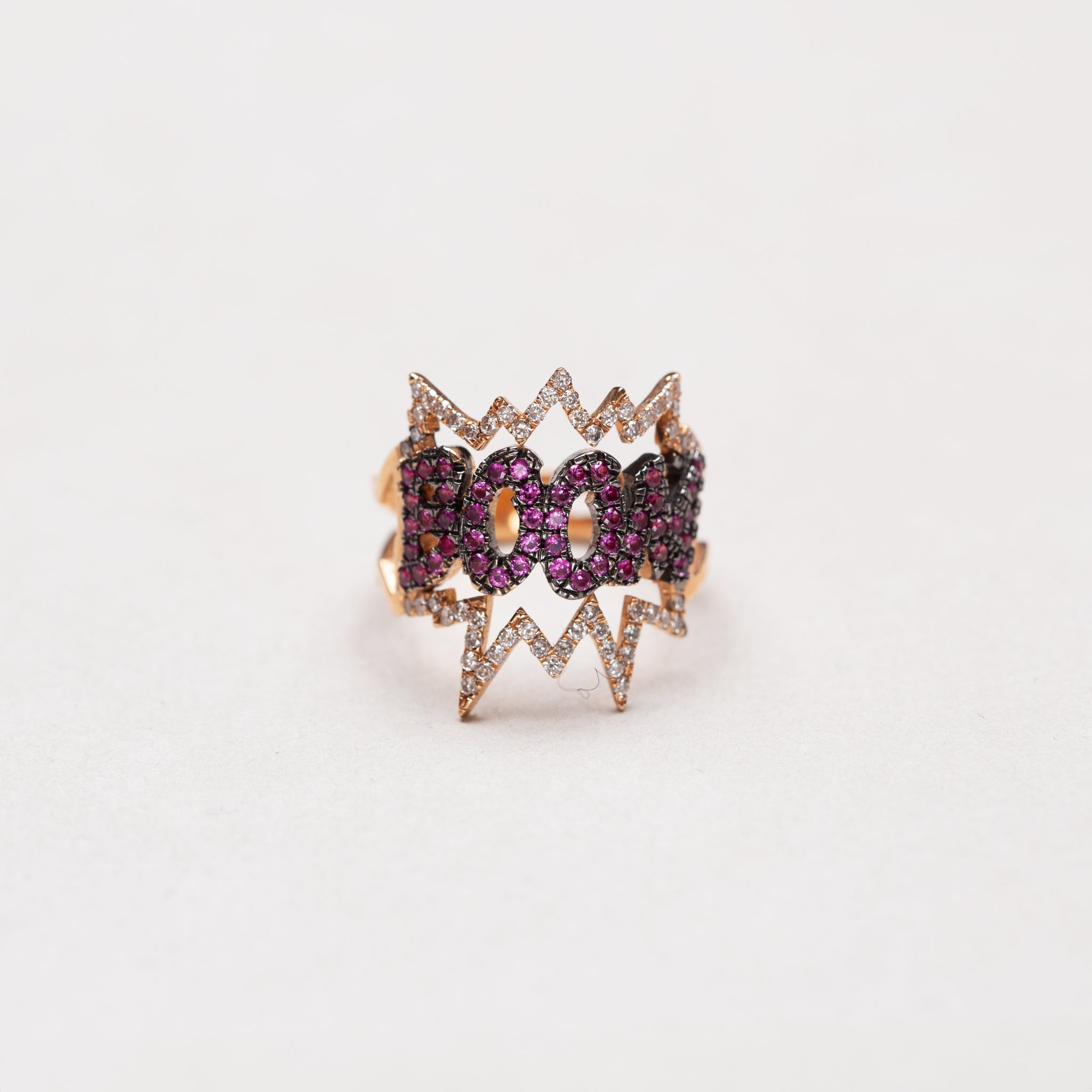 From Diane Kordas' Pop Art Collection, the BOOM Ring is crafted in 18k rose gold and set with 0.39ct white diamonds and 0.42ct pink sapphires. Inspired by artists like Roy Lichtenstein, the design reflects Diane’s passion for modern art and graphic design.