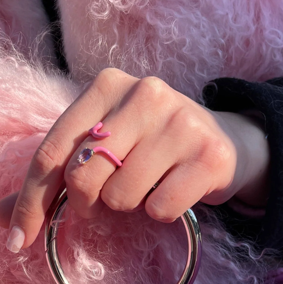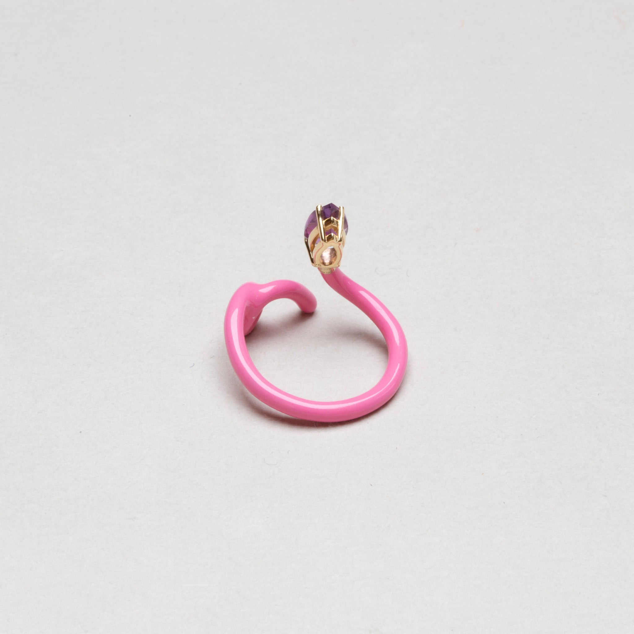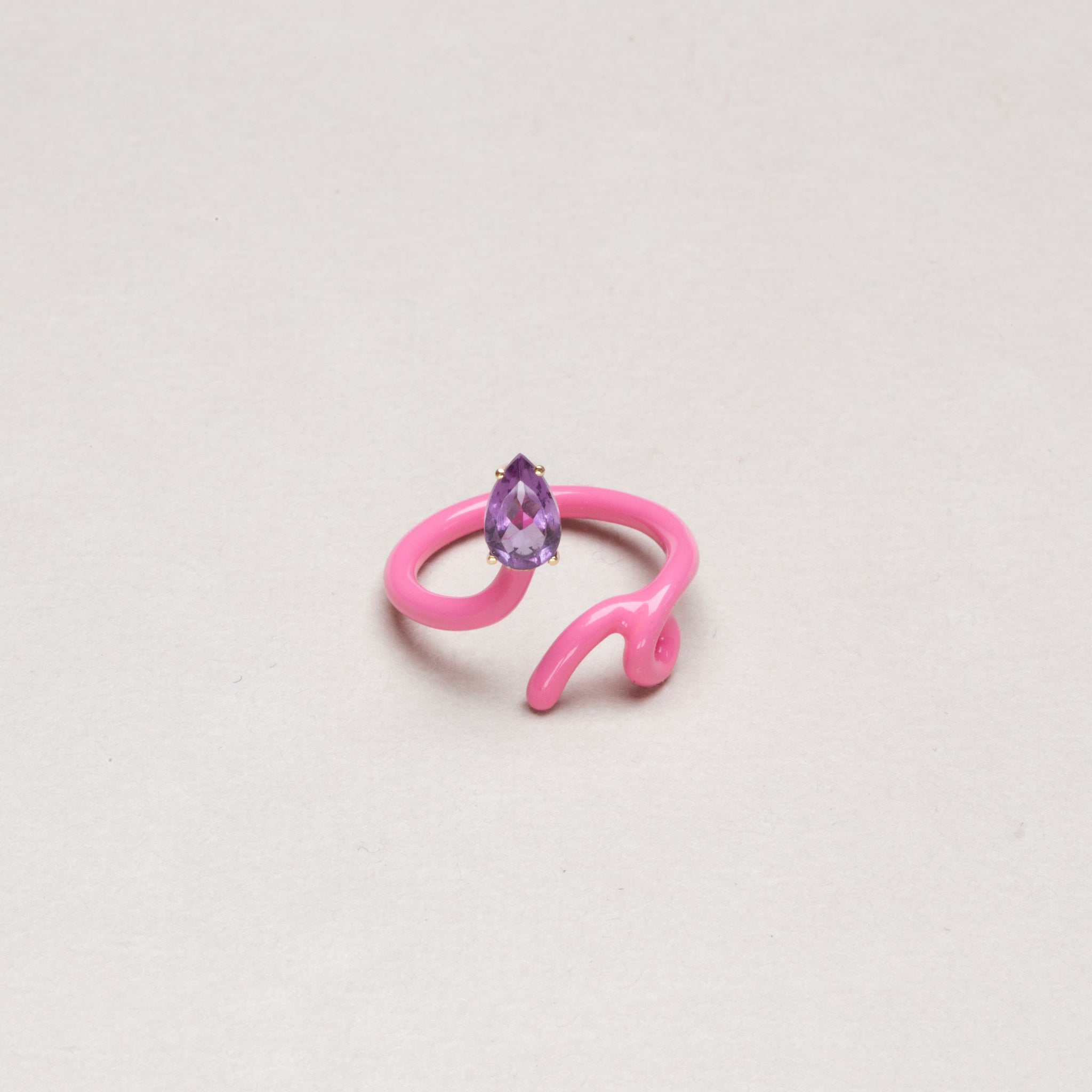 Playful and whimsical, the Baby Vine Ring wraps delicately around the finger with its sculptural, vine-like silhouette. Crafted in glossy enamel, the bold bubblegum-pink band is brought to life with a pear-cut amethyst, adding a sparkling pop of colour and contrast.
