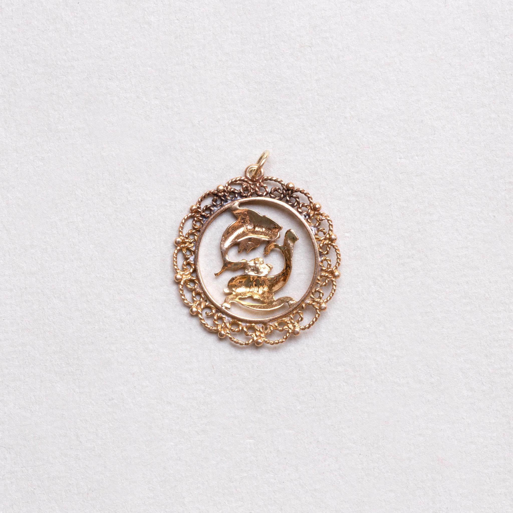 This vintage gold pendant features a finely detailed Pisces motif with two fish in circular motion, framed by an ornate openwork border. Perfect for those born under Pisces or as a meaningful gift for a loved one.