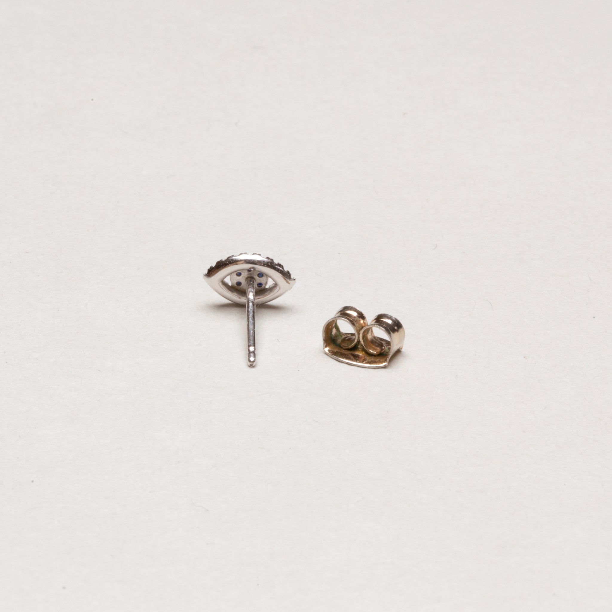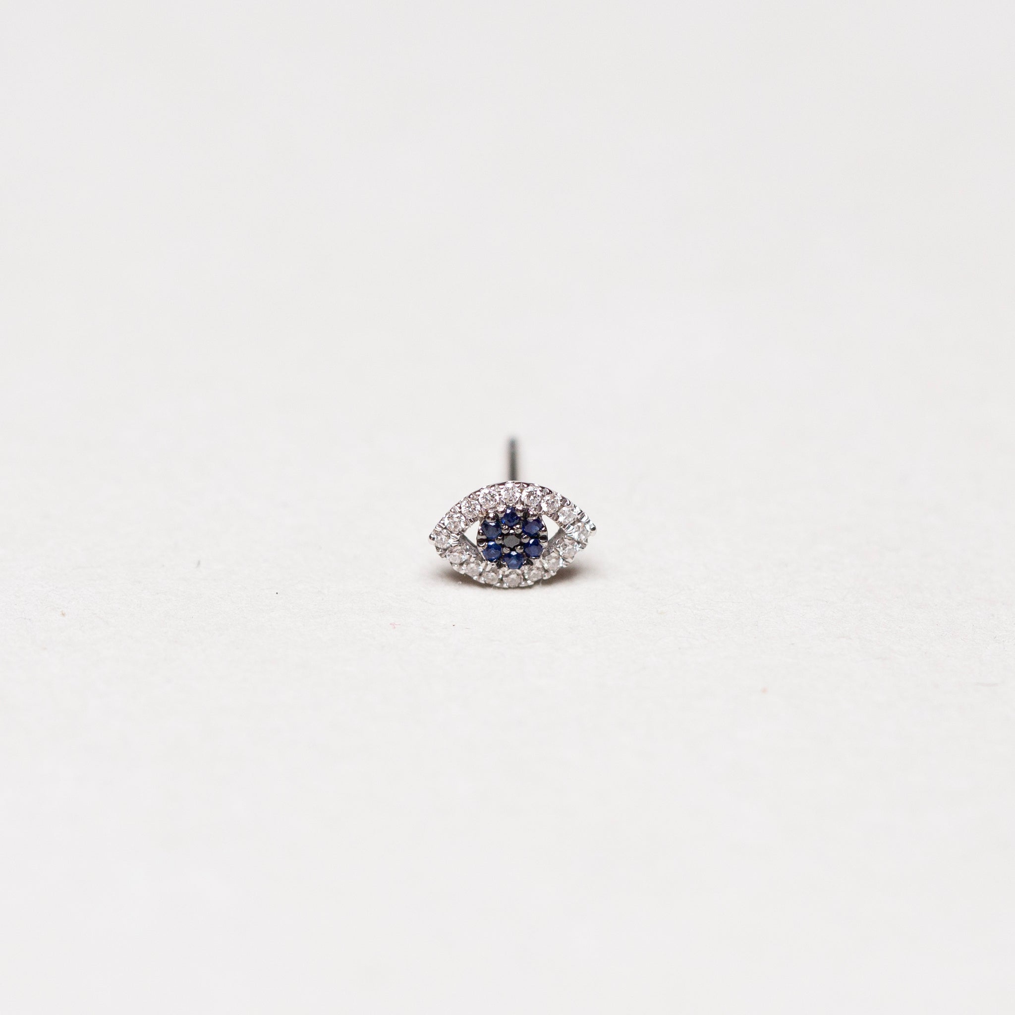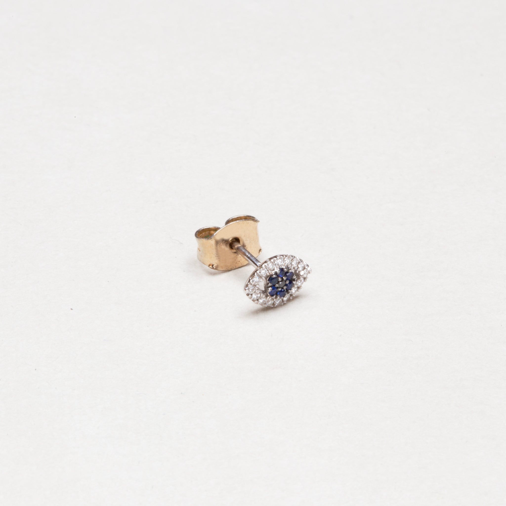 A delicate symbol of protection and style, this Evil Eye Stud features a rich blue sapphire at its centre, framed by a halo of sparkling white diamonds. Set in gold, the design captures the timeless mystique of the evil eye motif while adding a refined, modern elegance.