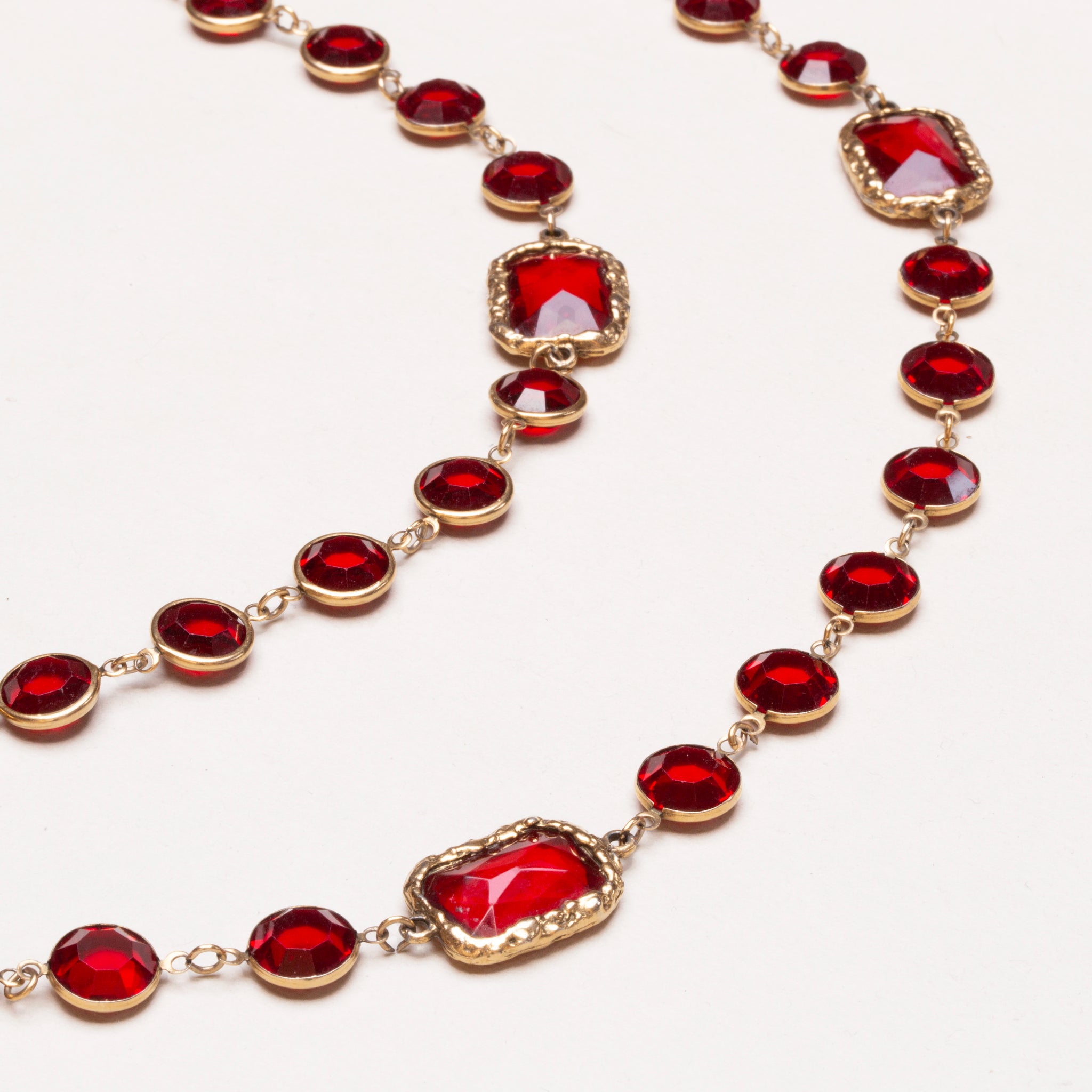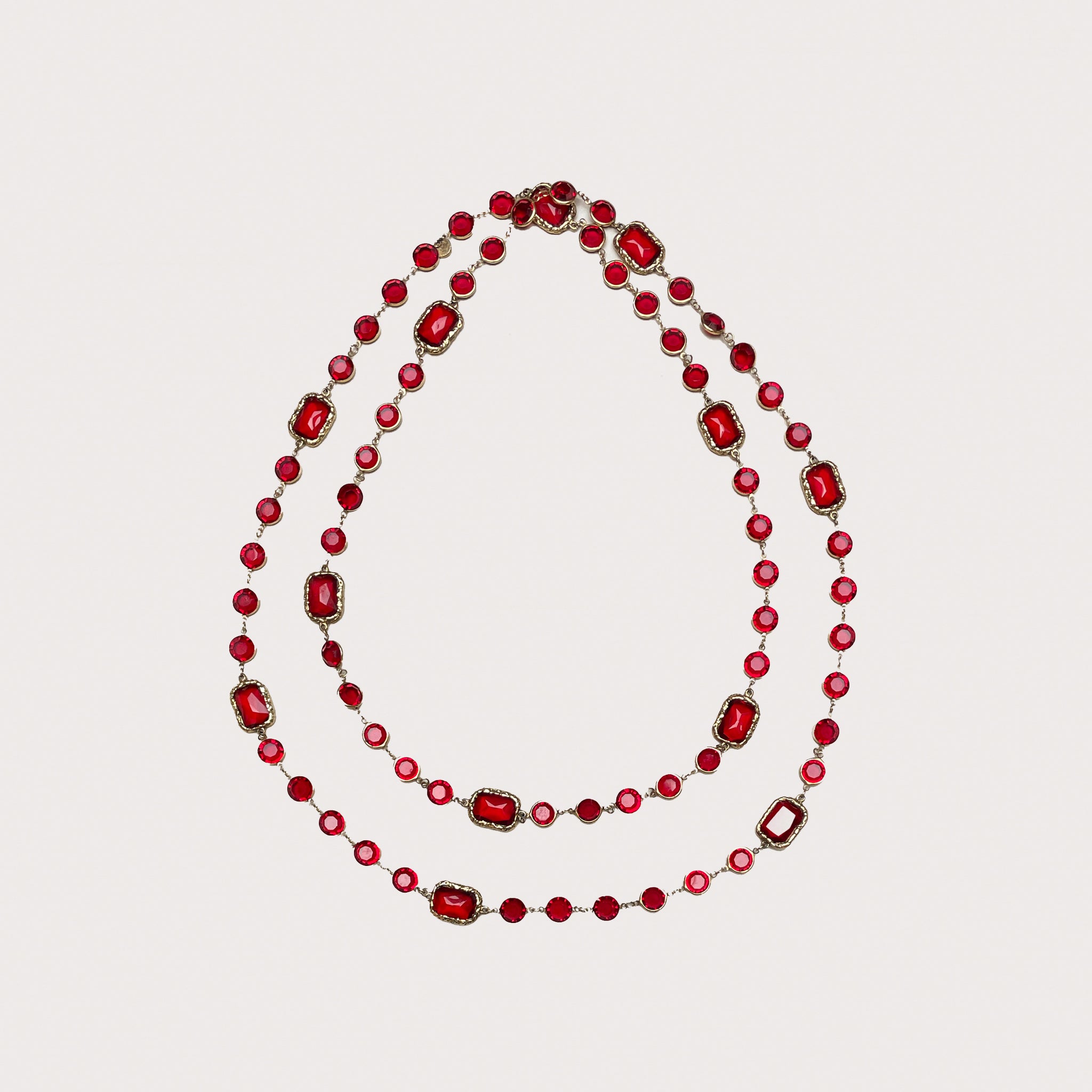 An exceptional vintage necklace by Chanel, showcasing the house’s iconic use of poured Gripoix glass in a rich, luminous red. This elegant longline design features a rhythmic arrangement of faceted round and rectangular stones, each set in warm gold-tone mounts.
