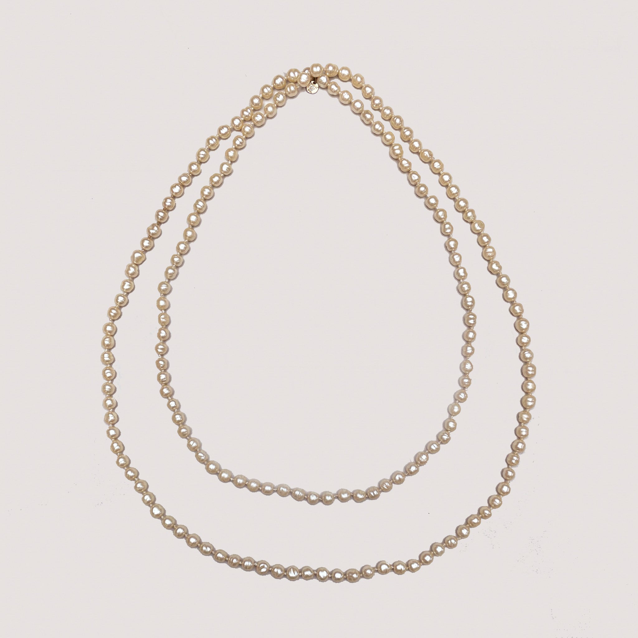 A classic vintage Chanel necklace featuring softly lustrous faux pearls in a warm cream tone. Each bead is individually knotted, giving the piece a fluid drape and a traditional finish.