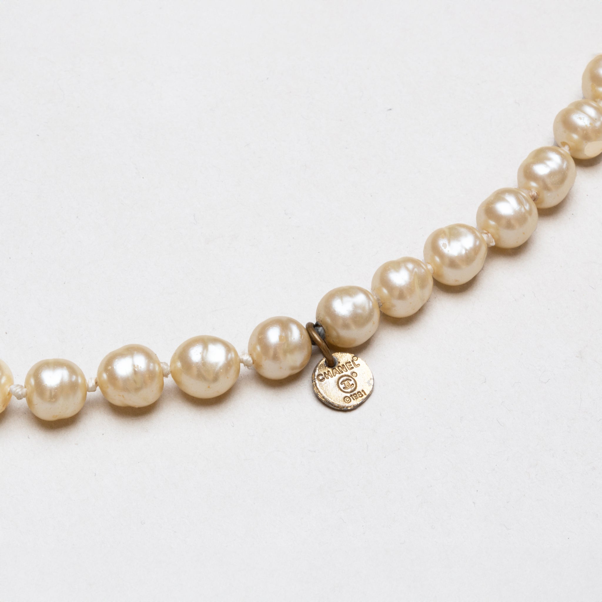 The necklace is finished with a small round charm stamped with the Chanel logo and ©1981, confirming it as a genuine vintage piece. The pearls have a slightly irregular shape, adding character and a more natural look.