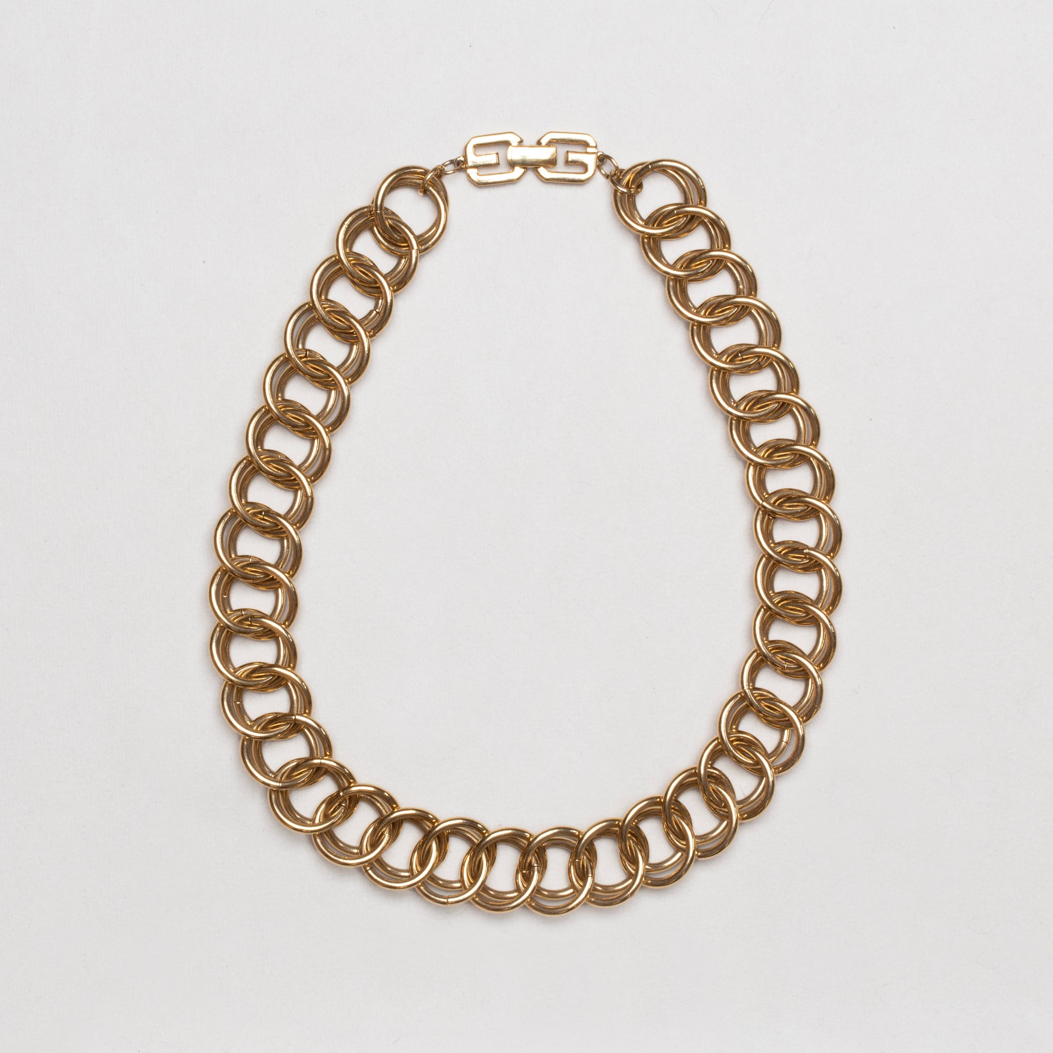 Another vintage gold-tone chain necklace by Givenchy, constructed from a continuous sequence of double-ring links, each formed from two smooth circular hoops interlocked to create a dense, dimensional chain.