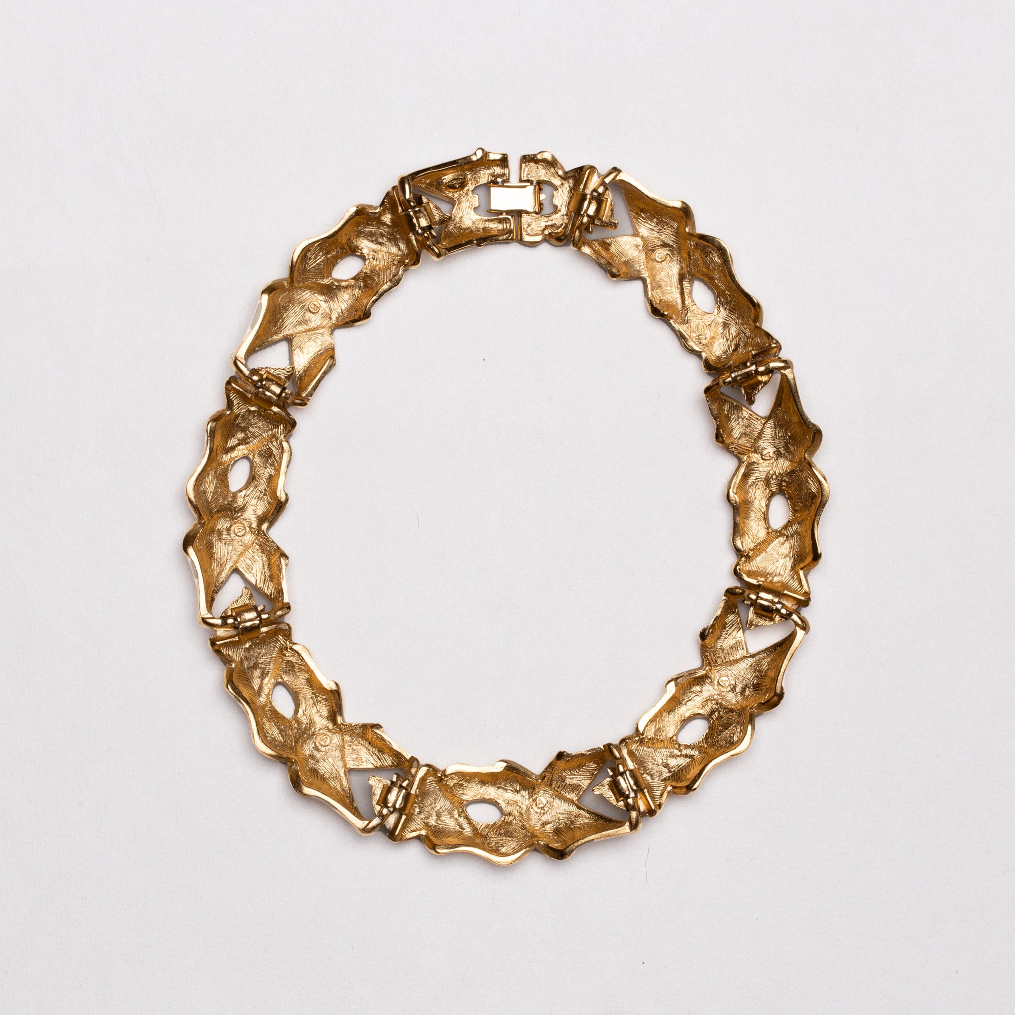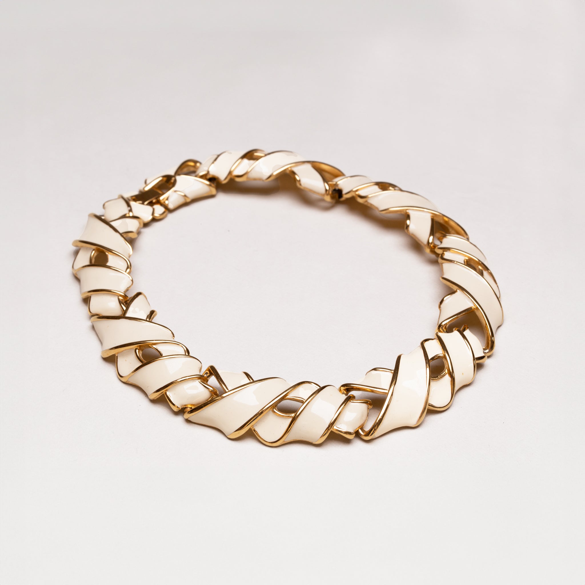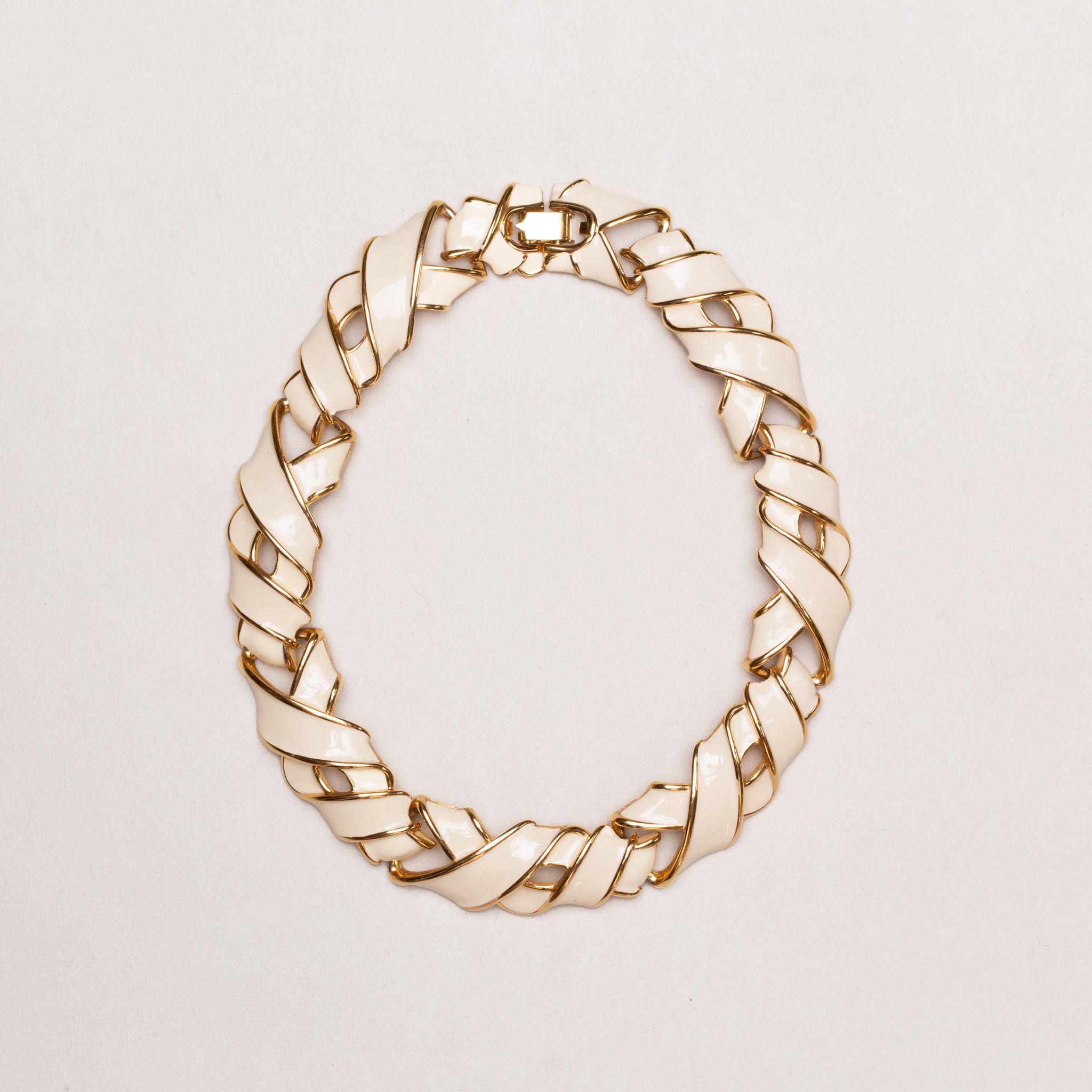 Chunky chain necklace composed of interlocking gold-tone metal links with ivory enamel panels. Each link features a curved, layered design that alternates between smooth enamel surfaces and polished metal edges. The necklace forms a continuous oval shape and sits close to the neckline. It is finished with a fold-over clasp for secure closure. The combination of metal and enamel creates a two-tone look with visible dimension and texture.