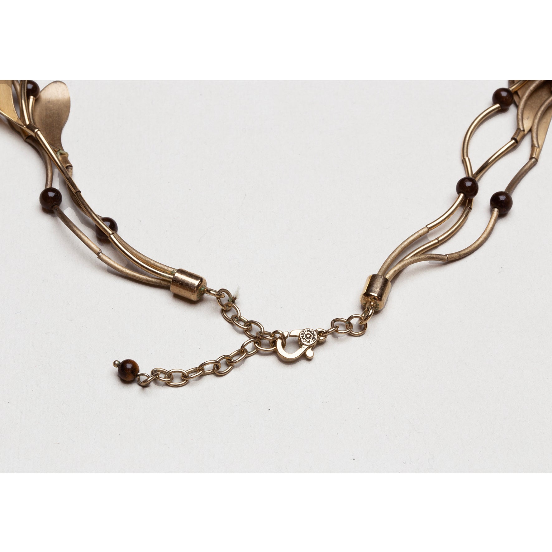An elegant layered necklace by Monet featuring softly curved brass strands adorned with organic leaf-shaped charms and warm brown beads. The mixed matte and polished finishes give it depth and movement, catching the light beautifully as you wear it.