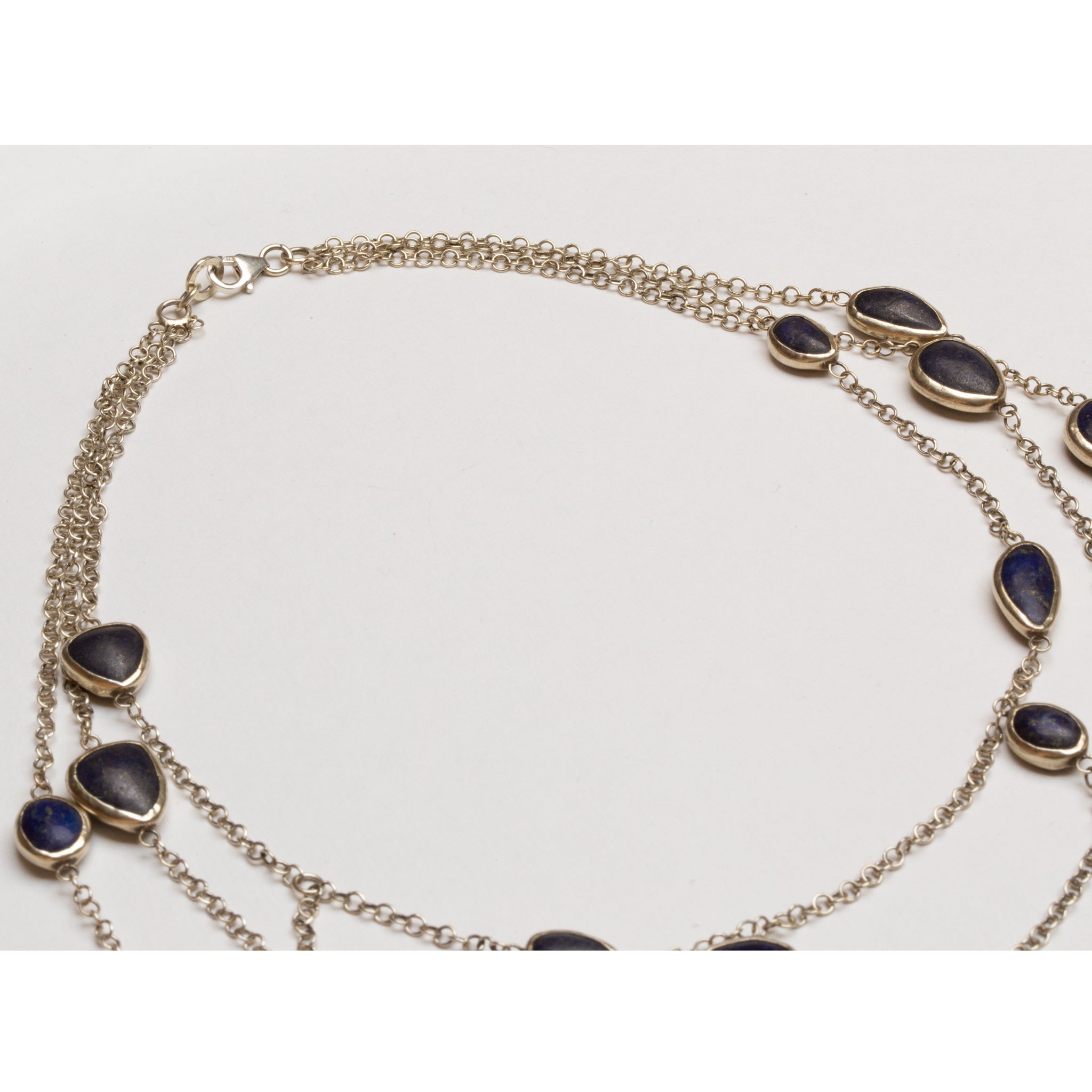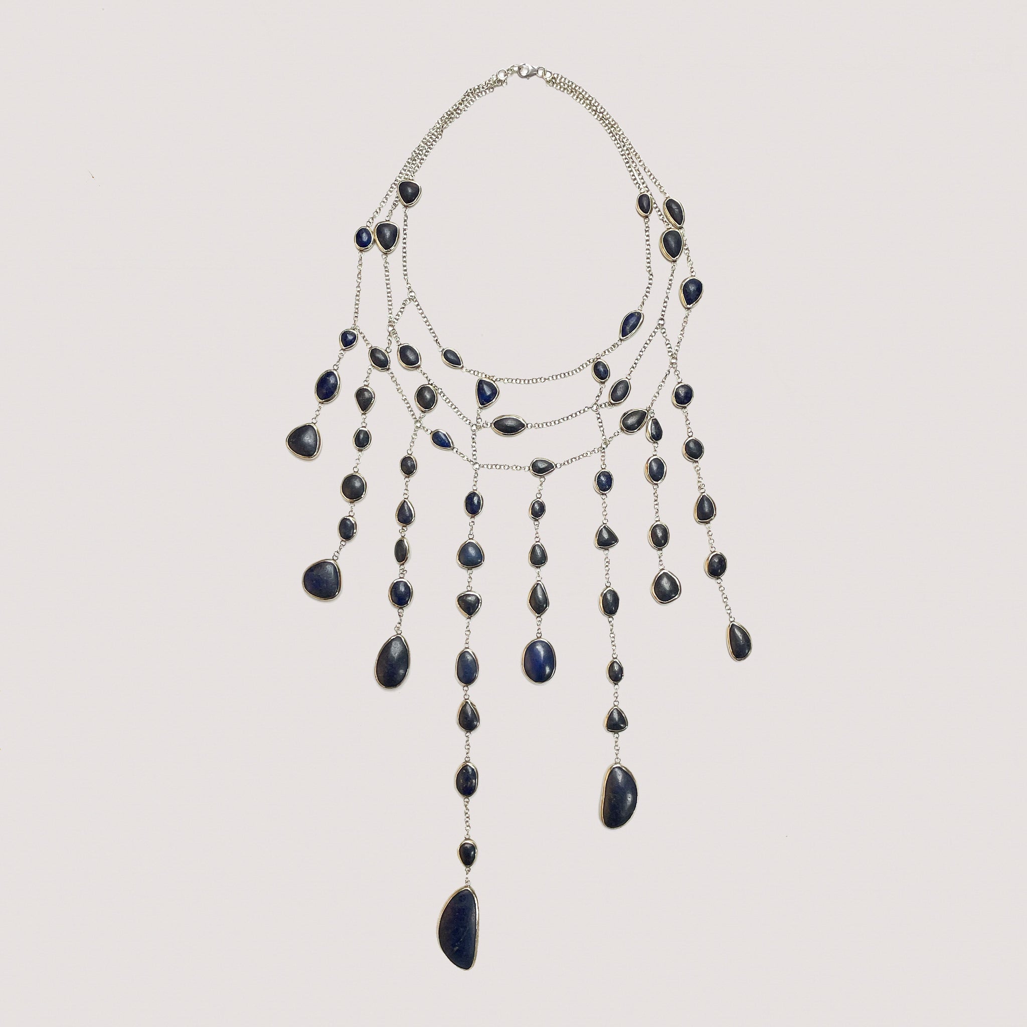 An exquisite statement piece, this vintage Pippa Small waterfall necklace captures the designer's signature organic elegance. Handcrafted in sterling silver, the necklace cascades with strands of deep lapis lazuli cabochons, each bezel-set to accentuate the natural form and beauty of the stones.