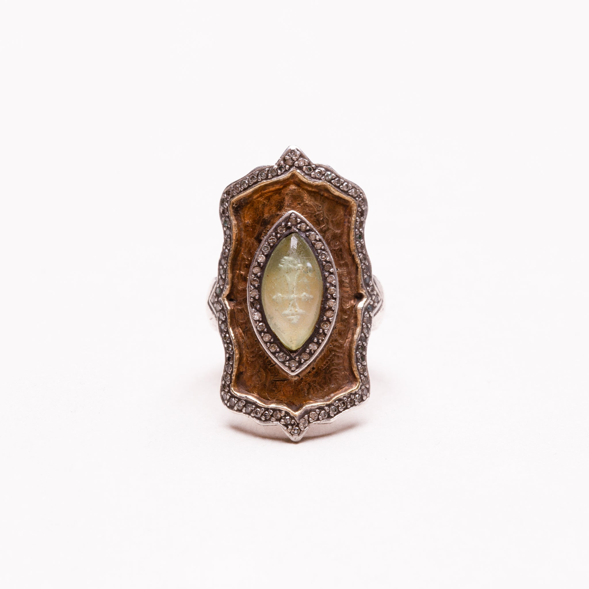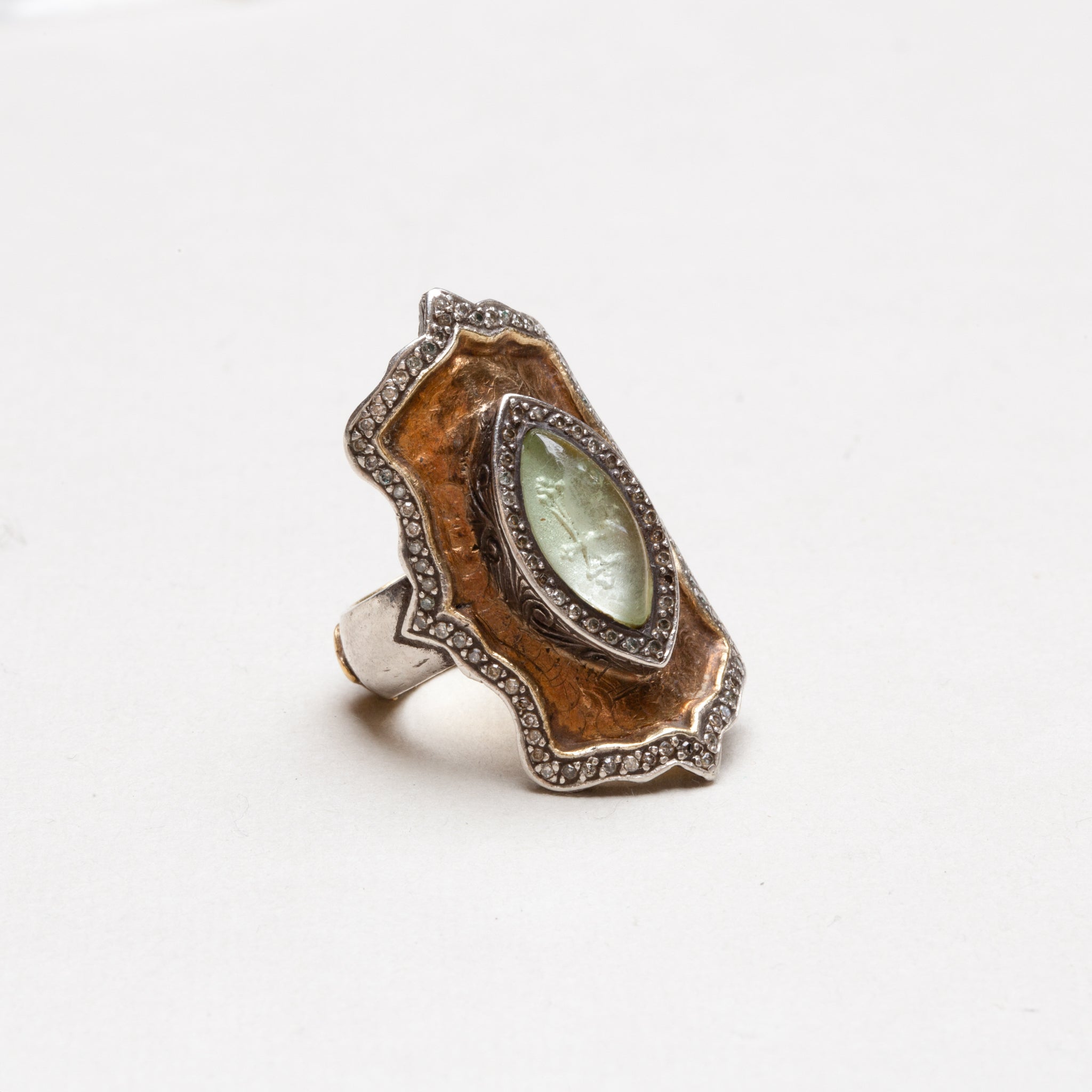 The Vintage Sevan Bıçakçı ring is a striking sculptural piece, centred with a luminous marquise-cut pale green gemstone that appears softly carved from within. The stone is framed by a delicately pavé-set diamond border.