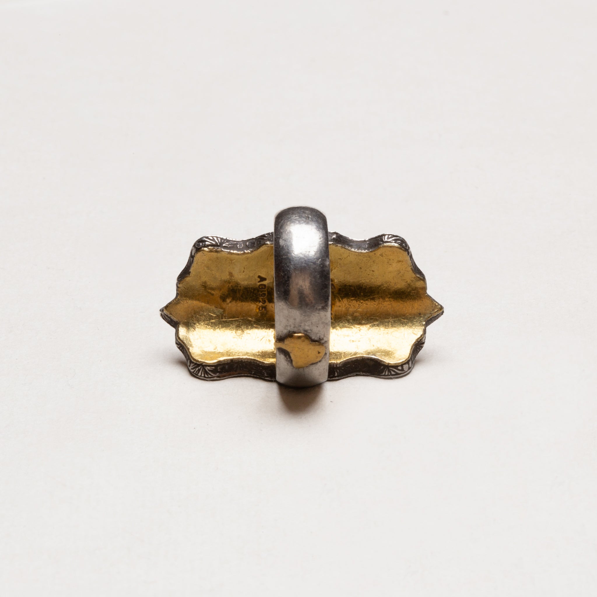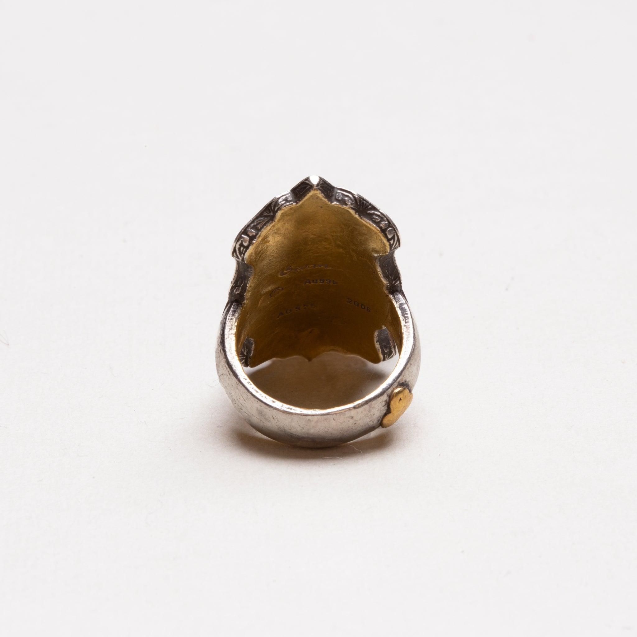 The ring is constructed of oxidised sterling silver and plated with 24ct gold on the reverse of the face.